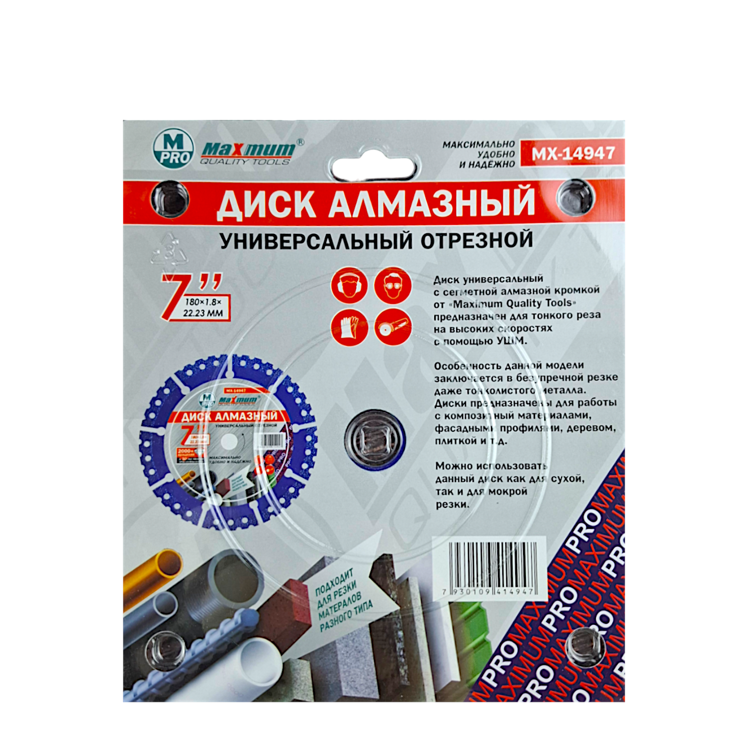 Ищете надежный алмазный диск для болгарки? Сегментный алмазный диск MAXIMUM MX 14947 диаметром 180 мм (7") — идеальное решение для сухой резки. Его сегментированная конструкция обеспечивает эффективное охлаждение и отвод частиц. Толщина реза составляет 1,8 мм, а стандартный посадочный размер 22,23 мм гарантирует совместимость с большинством углошлифовальных машин. Выберите профессионализм и качество с диском MAXIMUM!